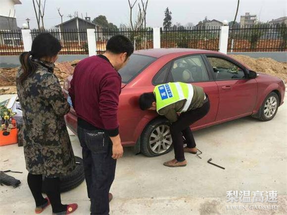 值班人员从单位找来更换轮胎工具,大家齐心协力下,约十分钟左右就更换完毕。同时帮助检查车辆状况。