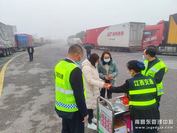11月18日因大雾天气导致大量外地长途车辆滞留在南昌南管理中心新干北收费站收费广场,该站迅速启动应急预案并开展“雾天送温暖”活动。