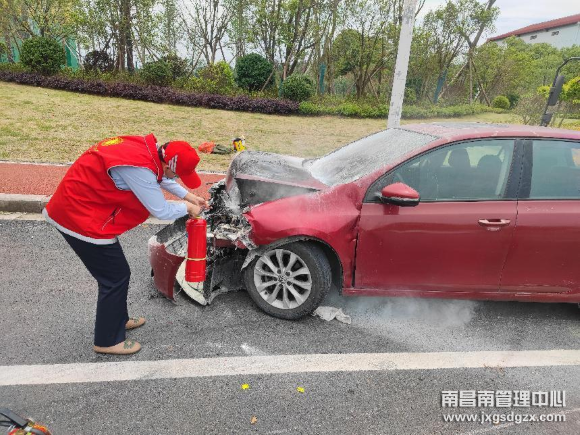 5月3日,一辆红色轿车因交通事故被拖车拖到南昌南管理中心杨梅岭收费站后突然起火。正在收费车道巡查的收费班长陈德美发现后立即拿起亭内的灭火器便冲向起火车辆。