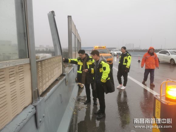 2月5日,昌宁高速昌宁连接线小蓝枢纽F匝道发生一起交通事故,一辆超宽车撞坏了匝道的声屏障,现场存在安全隐患。中心副总经理祝谭雍第一时间赴现场进行指挥,东乡养护所人员实施抢修。